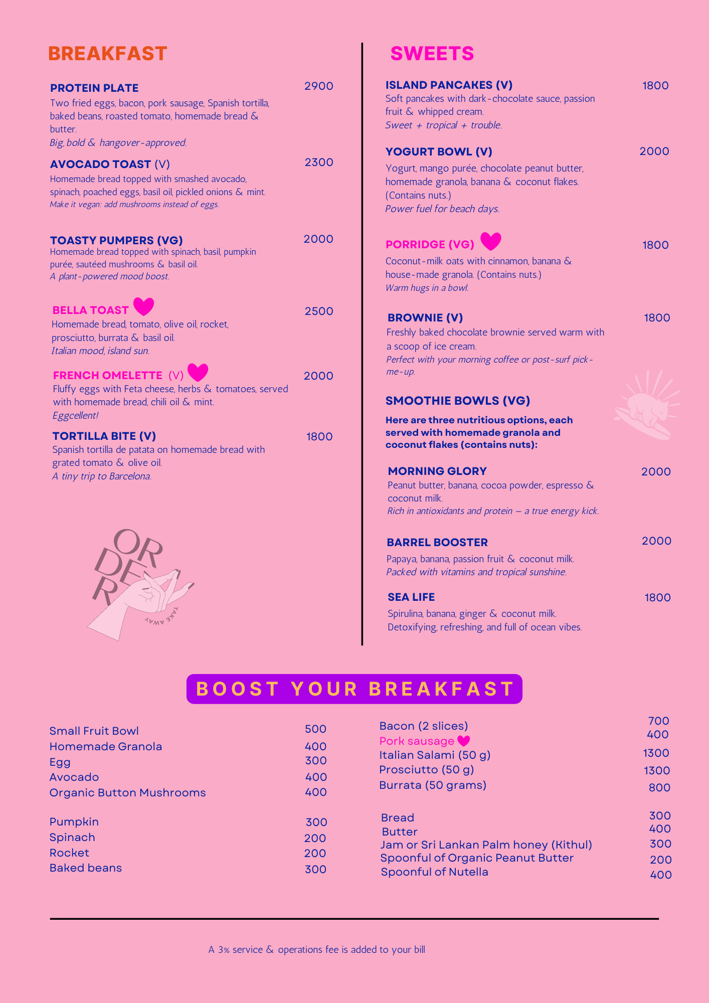 Our menu offers a delightful variety of fresh and healthy meals, along with mouthwatering juices and smoothies that will energize you for a day filled with adventure – be it exploring Sri Lanka’s beauty or riding the waves.